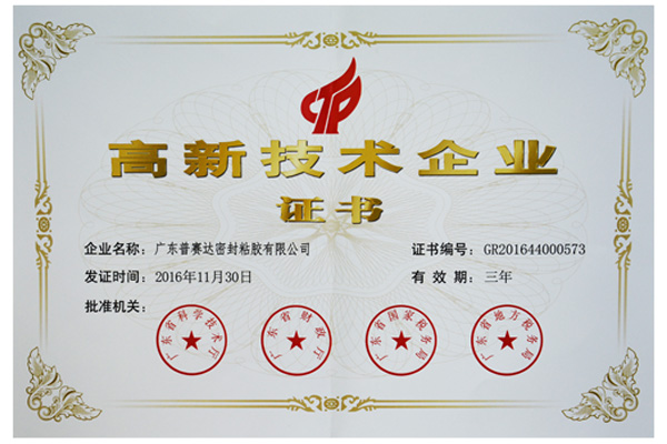 廣東普賽達(dá)密封粘膠有限公司榜上有名通過2016年國(guó)家高新技術(shù)企業(yè)復(fù)審。
