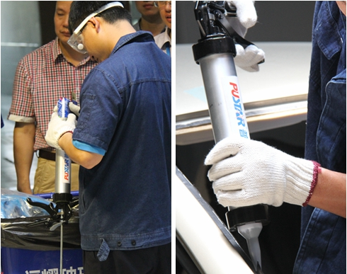 公司技術(shù)工程師就“汽車玻璃粘膠使用及注意事項(xiàng)”課程作了專業(yè)的講解,并引導(dǎo)學(xué)員進(jìn)行了現(xiàn)場(chǎng)的實(shí)際操作。