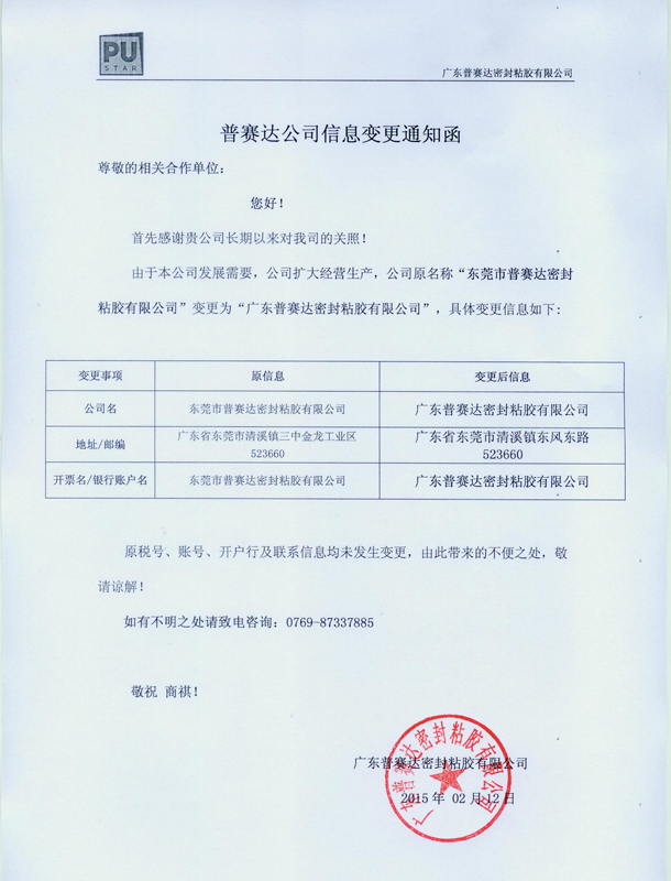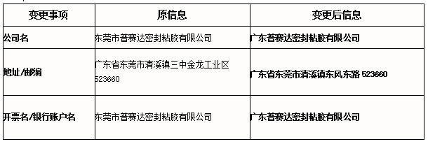 由于本公司發(fā)展需要,公司擴(kuò)大經(jīng)營生產(chǎn),公司原名稱“東莞市普賽達(dá)密封粘膠有限公司”變更為“廣東普賽達(dá)密封粘膠有限公司”,具體變更信息如下: