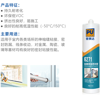 6271為單組分濕氣固化密封膠,采用中性硅酮膠作為原料, 對環(huán)境無污染,與金屬、陶瓷、玻璃、石材等多種基材具有良好的密封粘接性能。