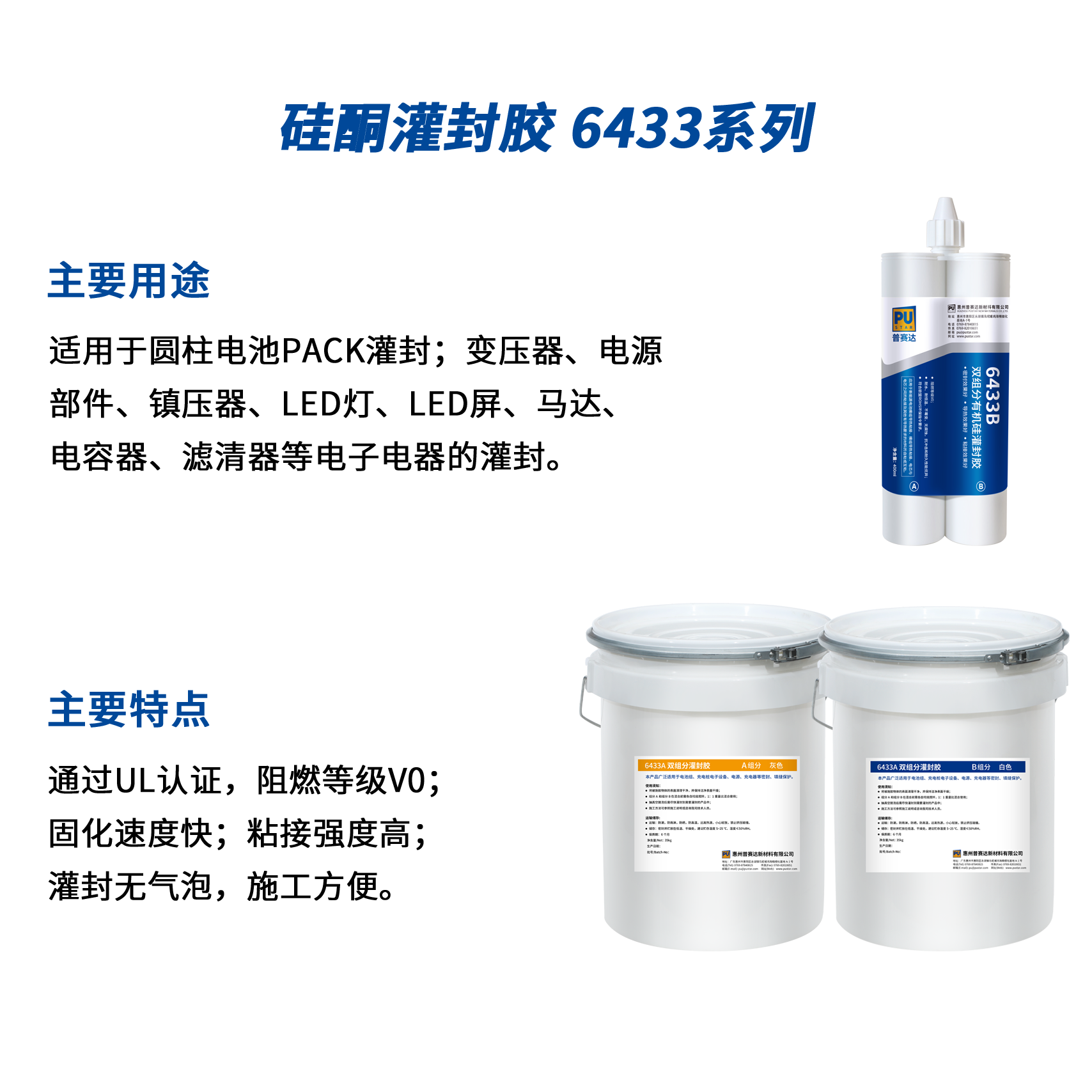 適用于圓柱電池PACK灌封;變壓器、電源部件、鎮(zhèn)壓器、LED燈、LED屏、馬達(dá)、電容器、濾清器等電子電器的灌封。