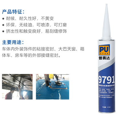 車體內(nèi)外裝飾件的粘接密封、大巴天窗、箱體車、房車等的外部接縫密封。