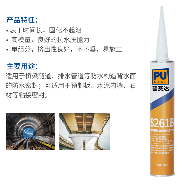 適用于橋梁隧道、排水管道等防水構(gòu)造背水面的防水密封;可適用于預(yù)制板、水泥內(nèi)墻、石材等粘接密封。