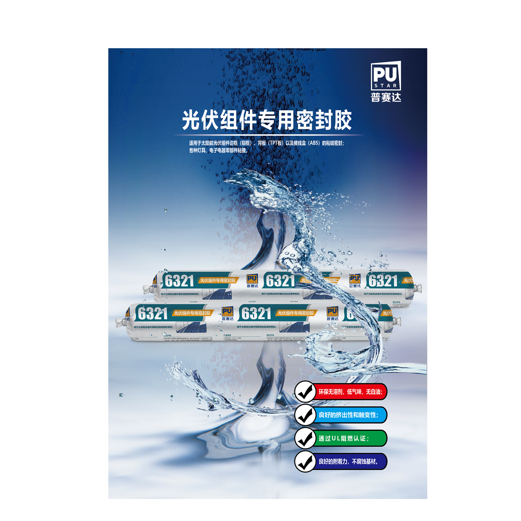 適用于太陽能光伏組件邊框(鋁框)、背板(TPT 板)以及接線 盒(ABS)的粘結(jié)密封;各種燈具、電子電器零部件粘接。