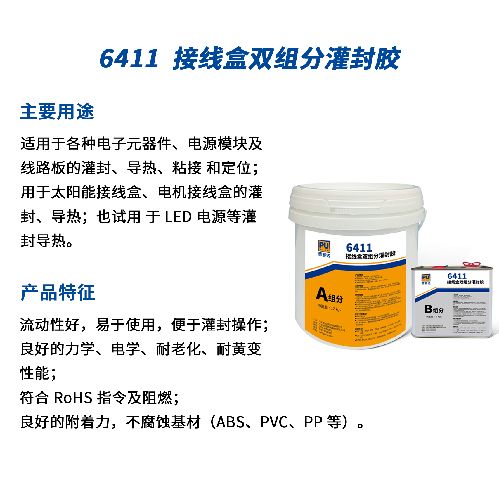 6411 是一種室溫固化的雙組分縮合型有機(jī)硅灌封膠,具備固化速度快、易流動(dòng)灌封、耐黃變、防水防潮、絕緣性能優(yōu)異、粘接基材廣泛等特點(diǎn),適合用于光伏接線盒、集成電路板、變壓器、防水電源等大面積粘合的密封件澆注和灌封。