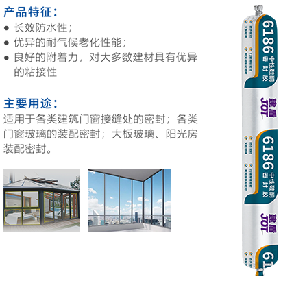 6186為單組分濕氣固化密封膠,采用中性硅酮膠作為原料,對(duì)環(huán)境無污染,與金屬、陶瓷、玻璃、石材等多種基材具有良好的密封粘接性能。